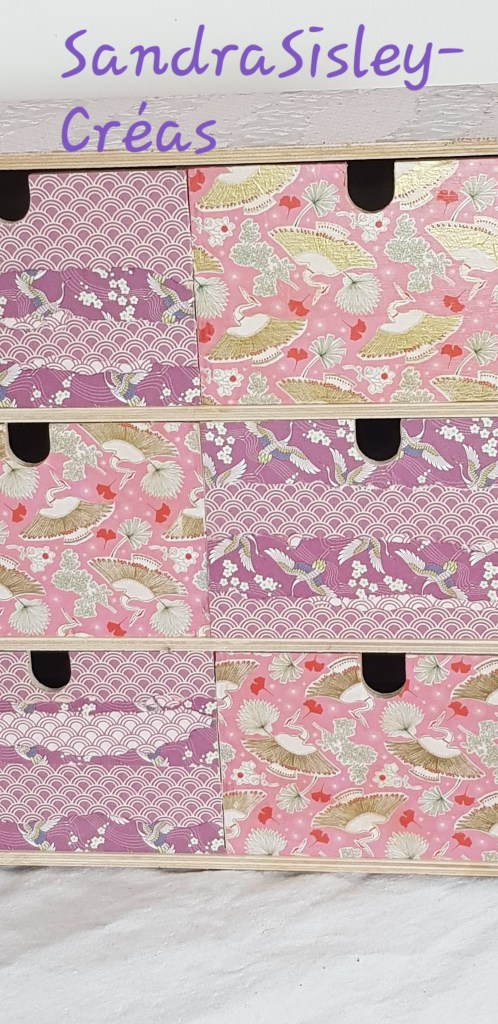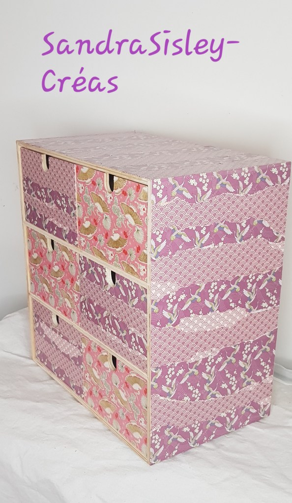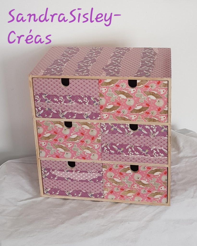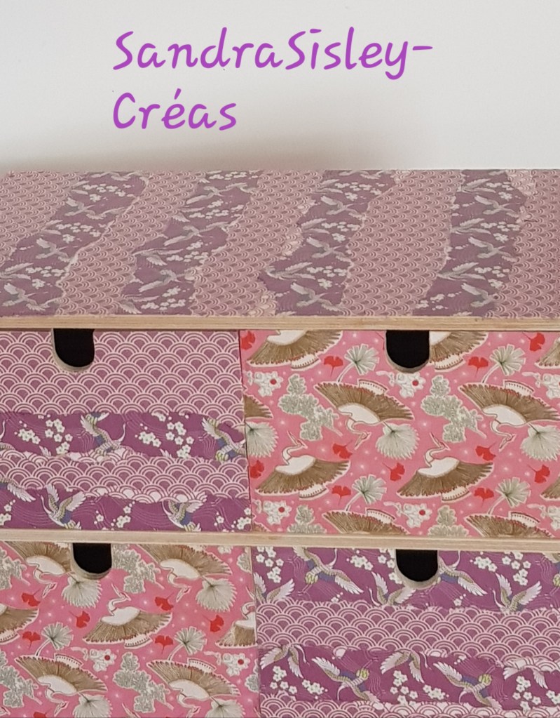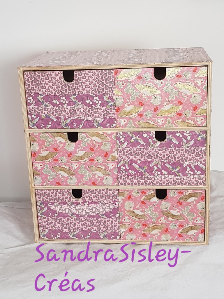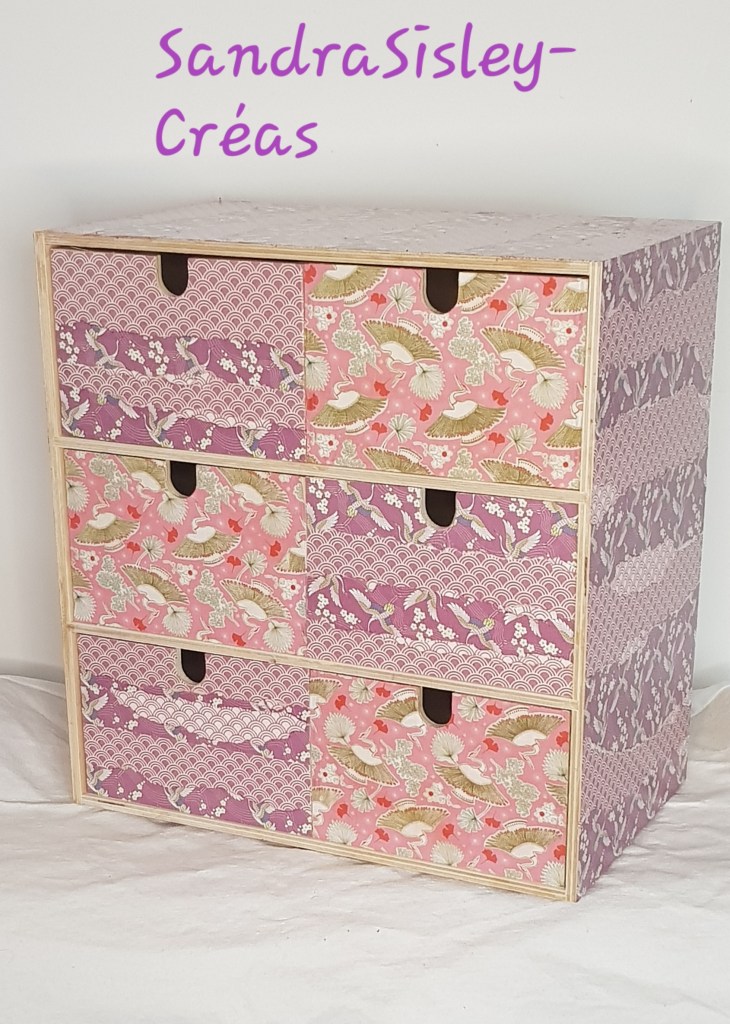 Et voilà le sixième bloc tiroirs pour ranger mon atelier est enfin terminé( manque juste une petite couche de vernis ). Il fait 18,5x31x32. J’ai utilisé deux motifs de papier origami ( les parties plus claires étaient au verso du motif grues ). N’en ayant plus suffisamment pour finir les trois derniers tiroirs, j’ai utilisé des chutes de décopatch motifs grues de l’un des autres blocs déjà réalisés. Je suis très contente du résultat et dans des tons que j’affectionne particulièrement.