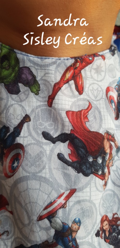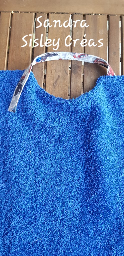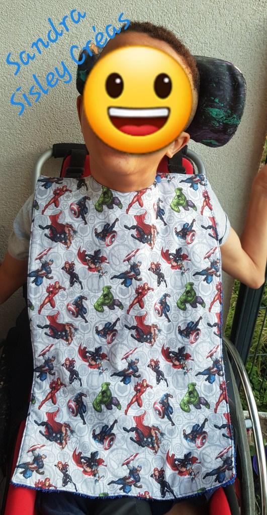 Après quelques heures de travail ( en plusieurs fois, devant gérer prise en charge, rendez-vous médicaux et préparation des repas entre temps), le voilà enfin terminé. Je voulais faire un essai de système d’attache sans pause de biais. Très contente du résultat final. Bavoir triples épaisseurs: tissu coton Avenger, recyclage d’alèse au milieu et éponge. 33 cm de large et 53 cm de long pour bien descendre jusqu’au cuisse et protéger le pantalon.