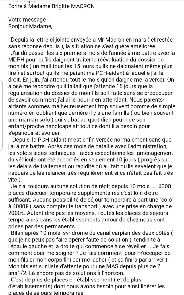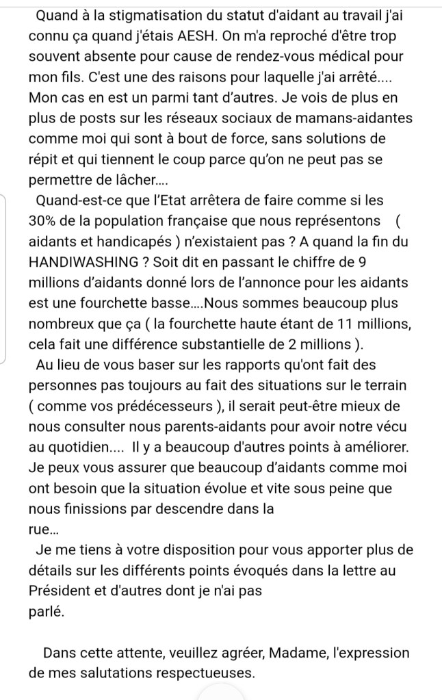 Motivée par les annonces faites par la ministre des Solidarités et des Familles Aurore Bergé en « faveur » des aidants vendredi qui ne correspondent pas à la réalité de notre quotidien mais aussi à une conversation téléphonique constructive et très intéressante mardi ( qui devrait donner lieu à un projet imprévu dans les semaines qui viennent ), je me suis enfin décidé à faire ces fameuses lettres ( suite de la Lettre au Président de la République restée sans réponse ) que je dois faire depuis près de six mois.